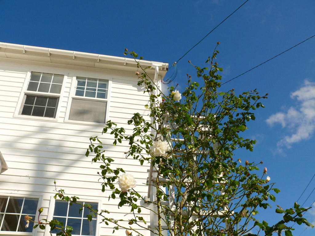 真っ青な空に真っ白なお家、そこに白いバラ、まるで絵に描いたようですね。