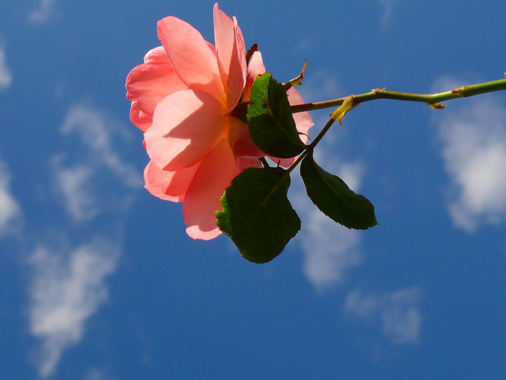 バラの色も空の色も、なんて美しいんでしょう!白い雲がよく似合う青ですね!芝生で寝ころんで見上げたらこの景色、最高ですね(*^^*)