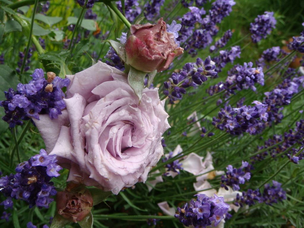 ラベンダーとバラ スイートムーンのコラボ。 鉢栽培のスイートムーン後方にイングリッシュラベンダーを植えています。~ マイガーデンにて ~
