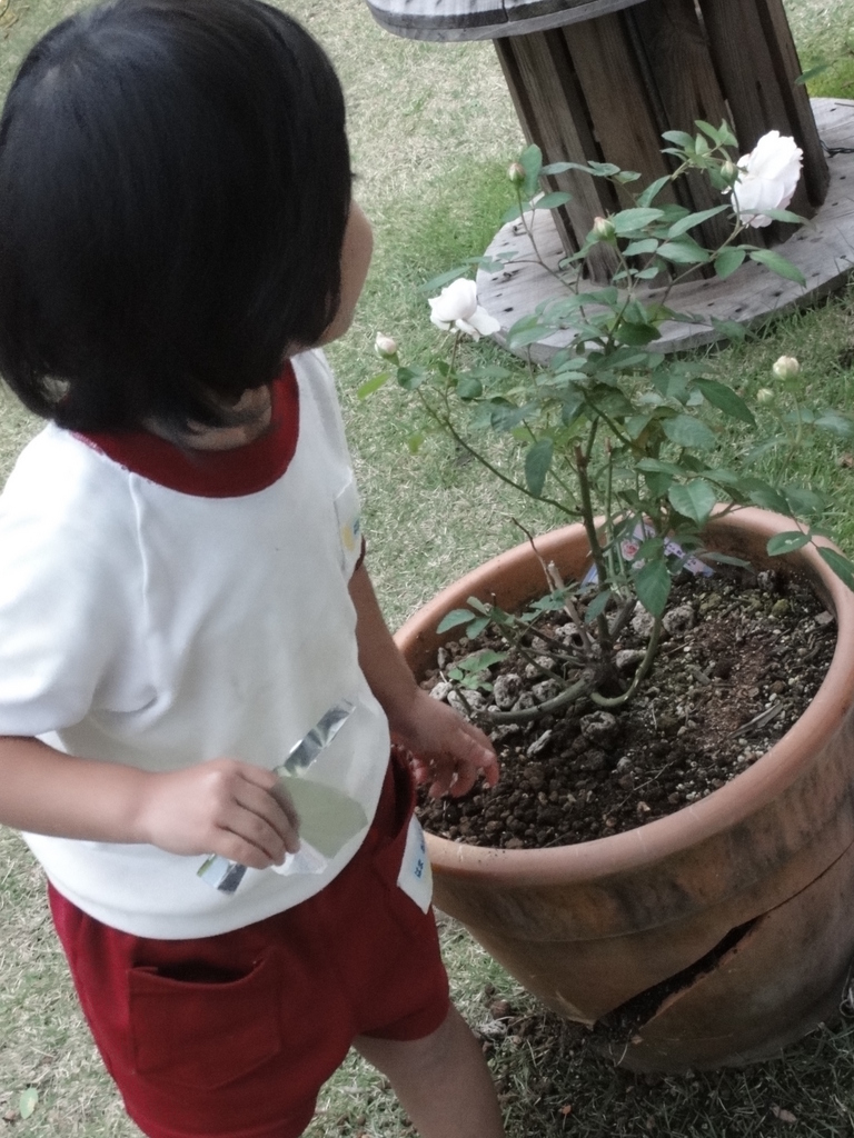 バラの株自体が無事だったのが不幸中の幸いでしたね。お嬢さんが紙とテープを手に持って、修理しようとしてくれてるのかな^^? 割れた鉢をアロンアルファでくっつけたら、お子さんの大事なもの入れ(どんぐりとか松ぼっくりとか)に使えるかもしれませんよ~^^