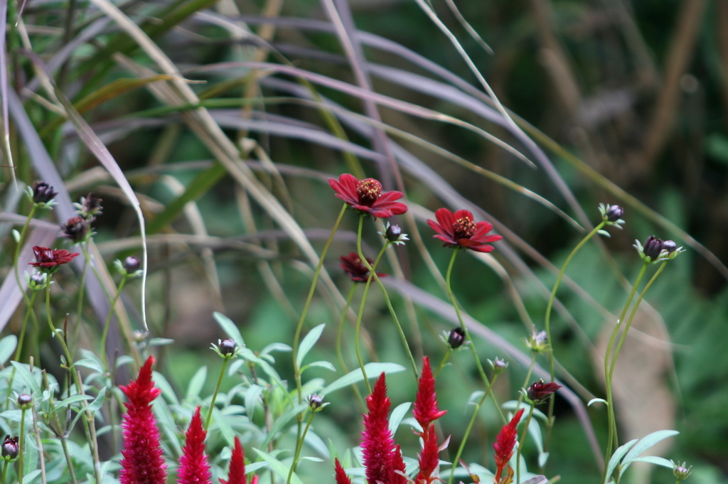ケイトウ、チョコレートコスモス、ニューサイラン、赤~黒系、きれいですね。