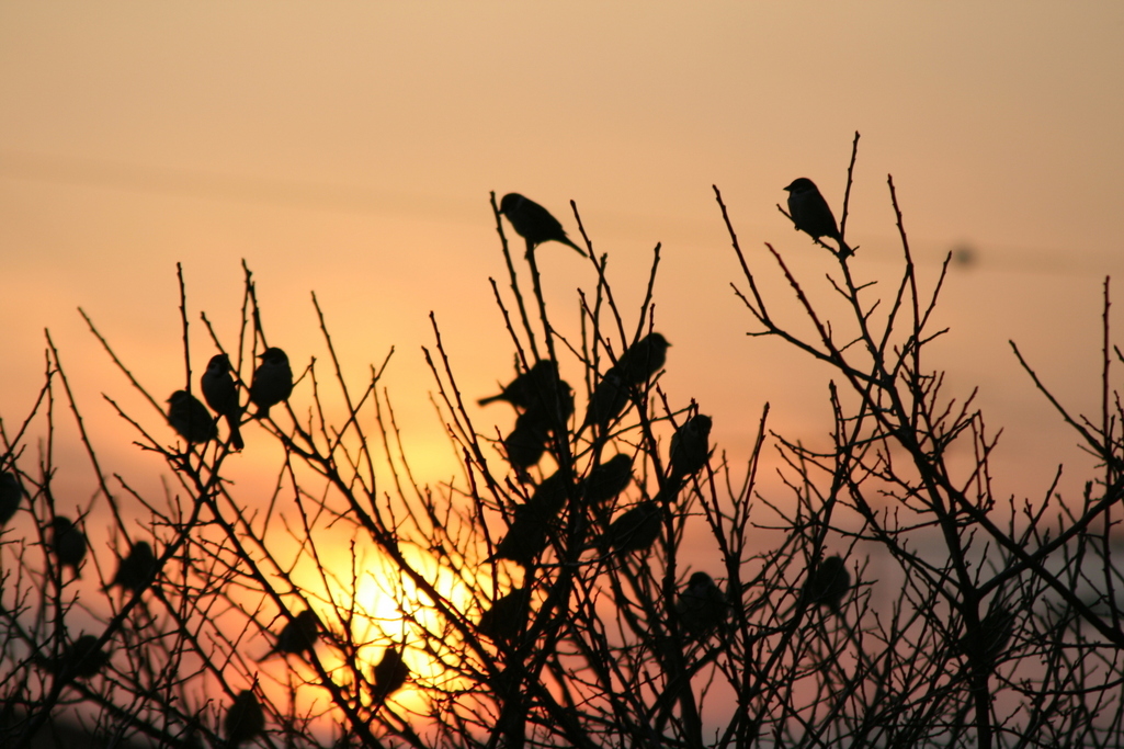 澄んだ空気に沈む夕日、雀の家族。なんて素敵なお写真なのでしょう(*^^*)!ず~っと見ていたくなります。