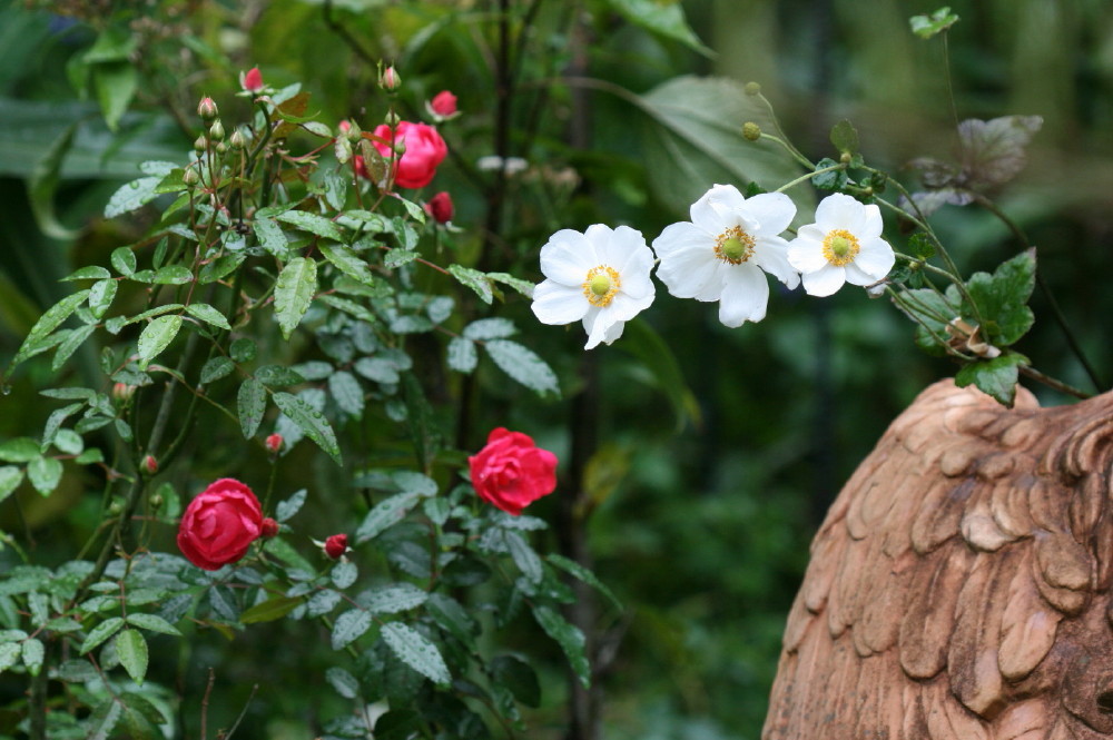 シュウメイギクの白さと奥の赤いバラの対比がとっても綺麗ですね。