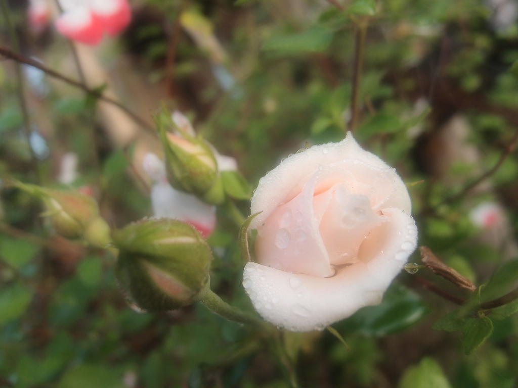 チェリーセージに隠れて奥のほうで蕾を沢山付けていました。その一つが開きかけています。名前がわかりません。(^_^;)
