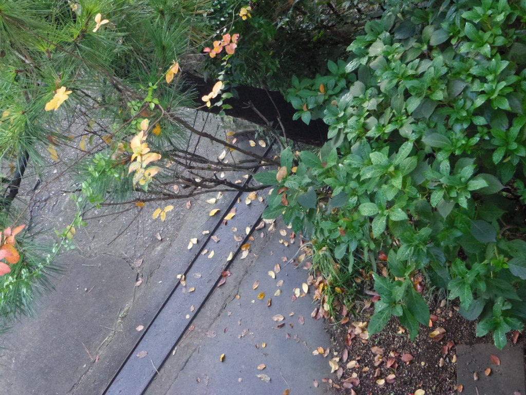 ベランダから見下ろしたら、サルスベリが散っていました。アジサイはまだまだ緑。