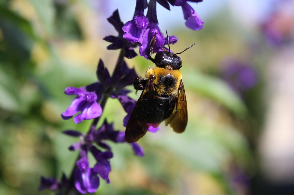 クマバチですね^^ 羽音にびっくりさせられますが 優しい性格のようですよ^^