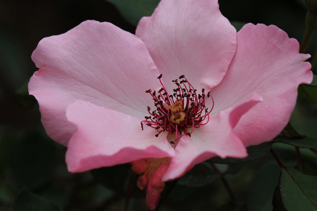 蕊の色が変わっていて、一重の変わった色で目を引きますね~