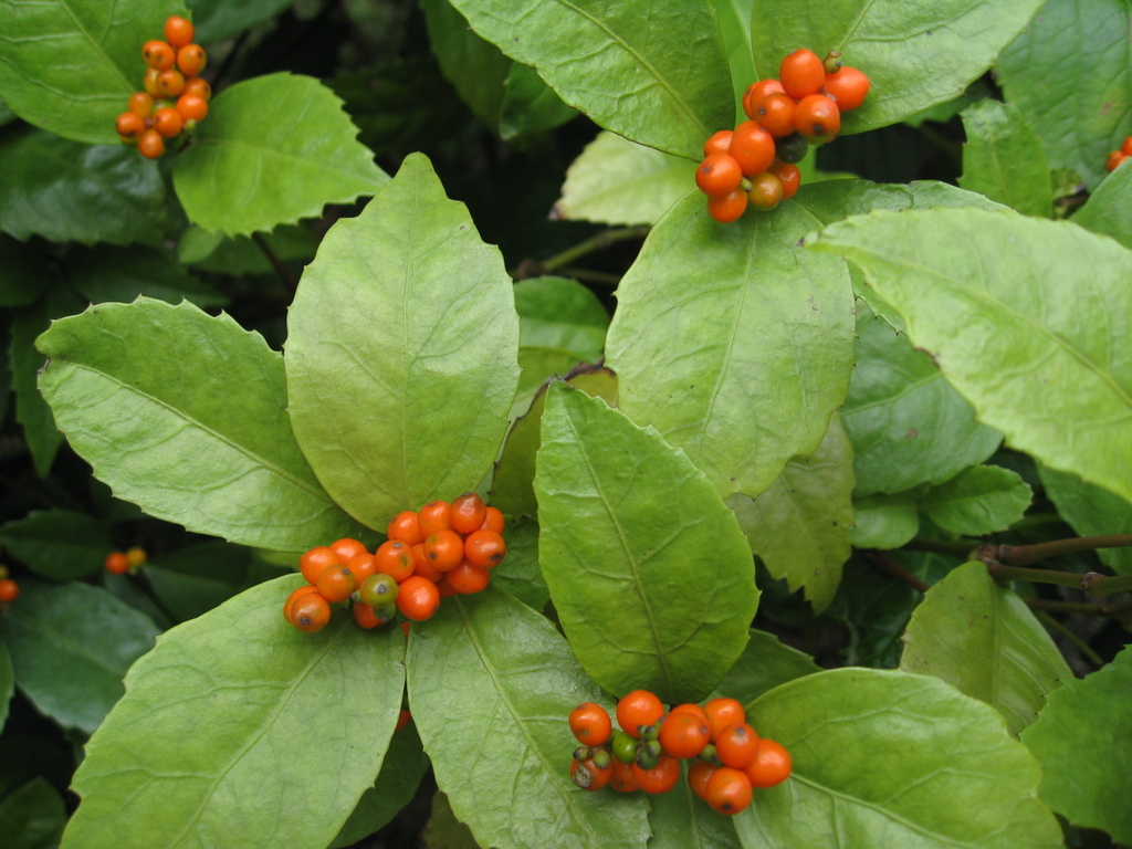色づき始めたセンリョウです。 葉っぱの色が・・お正月には活き活きグリーンになるのかな?
