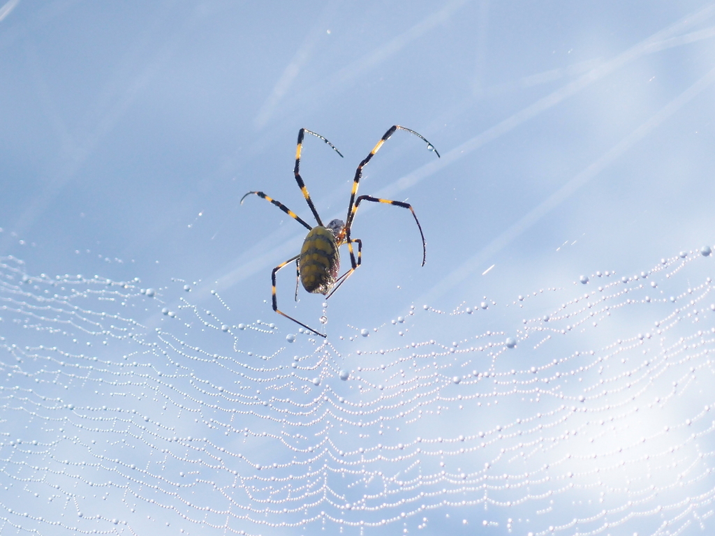 蜘蛛の糸がキラキラのビーズ見たいですね!青空に映えますね!