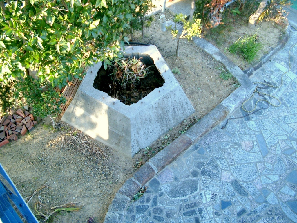 コンクリートむき出しで美しいとはいえないが、いつかこの上にオベリスクを置いてみたい。五角錐が二重に組まれた構造物をイメージしている。土台は正12面体の上半分。下半分は地面の中。惑星からのエネルギーを受信できそうだ。コンクリートには、オオイタビを這わそうとしているが、苗が寒風でしおれてしまっている。