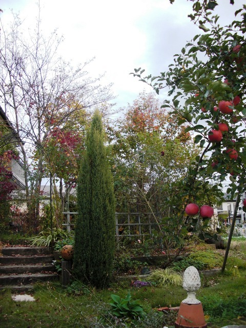いいお庭ですね。リンゴの赤が素敵。ひっくり買った植木鉢の上の白いものは何?
