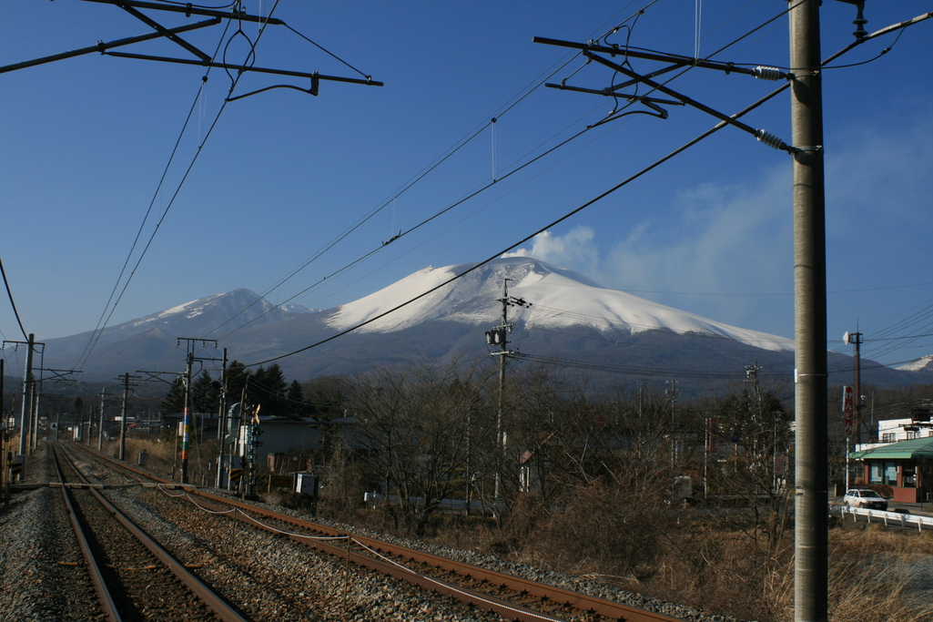 軽井沢駅から中軽井沢駅に向かうしなの鉄道の線路上から見た浅間山です。