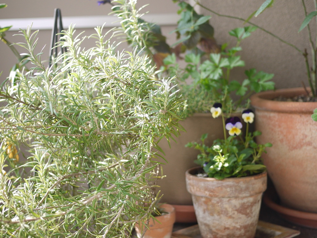うちで一番の長老、10年物のローズマリーとその仲間たち。地味な寄せ植えです。