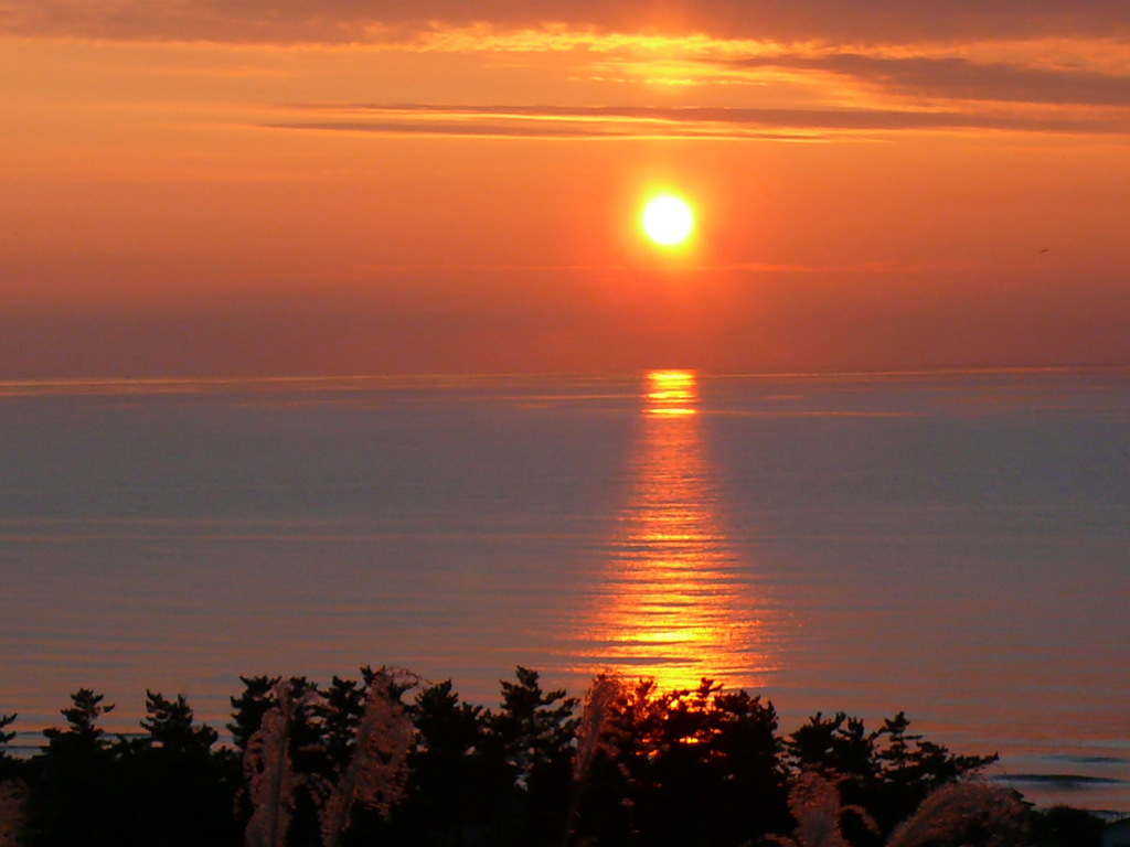 すばらしい風景ですね。地平線からオレンジロードが、海を二分するように照らしています。