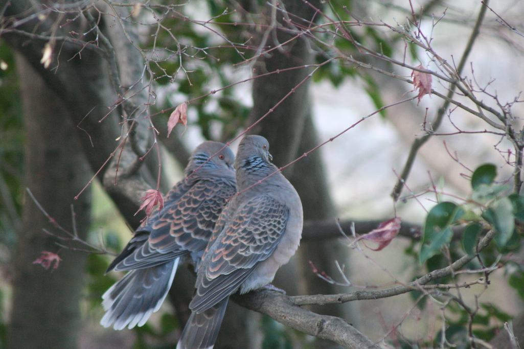 普段見慣れているはずのハトですが、こんなにも羽の模様が綺麗だったんですね。まだ若いカップルのように見えます。