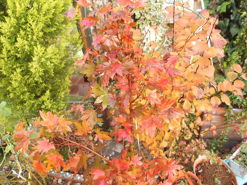 コハウチワカエデとゆすらうめ、なぜかゴールドクレスト妙な取り合わせです。