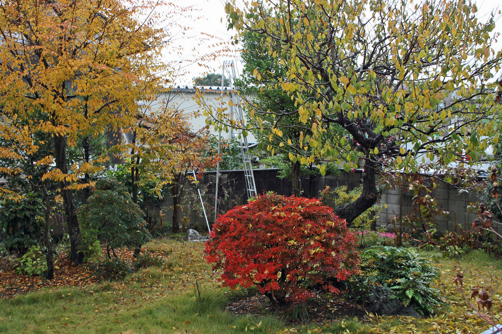 今年はみなさん紅葉がダメだとおっしゃってますね。うちの方ではもみじが青いまま枯れてます・・・^^; 背景にうつってるすんごく長~い脚立は、作業用ですか?これに登ると考えるだけでも足がすくんじゃいそうです。