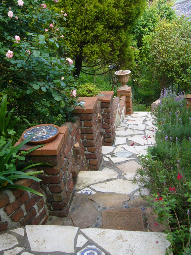 北斜面の裏庭のコンクリート階段(既存60段)に、夫と共同で、石やタイルを張り付け、煉瓦の壁はコンクリートをこねて作りました。記念の石やビー玉、瓦なども入れ混んで楽しい空間になりました♪