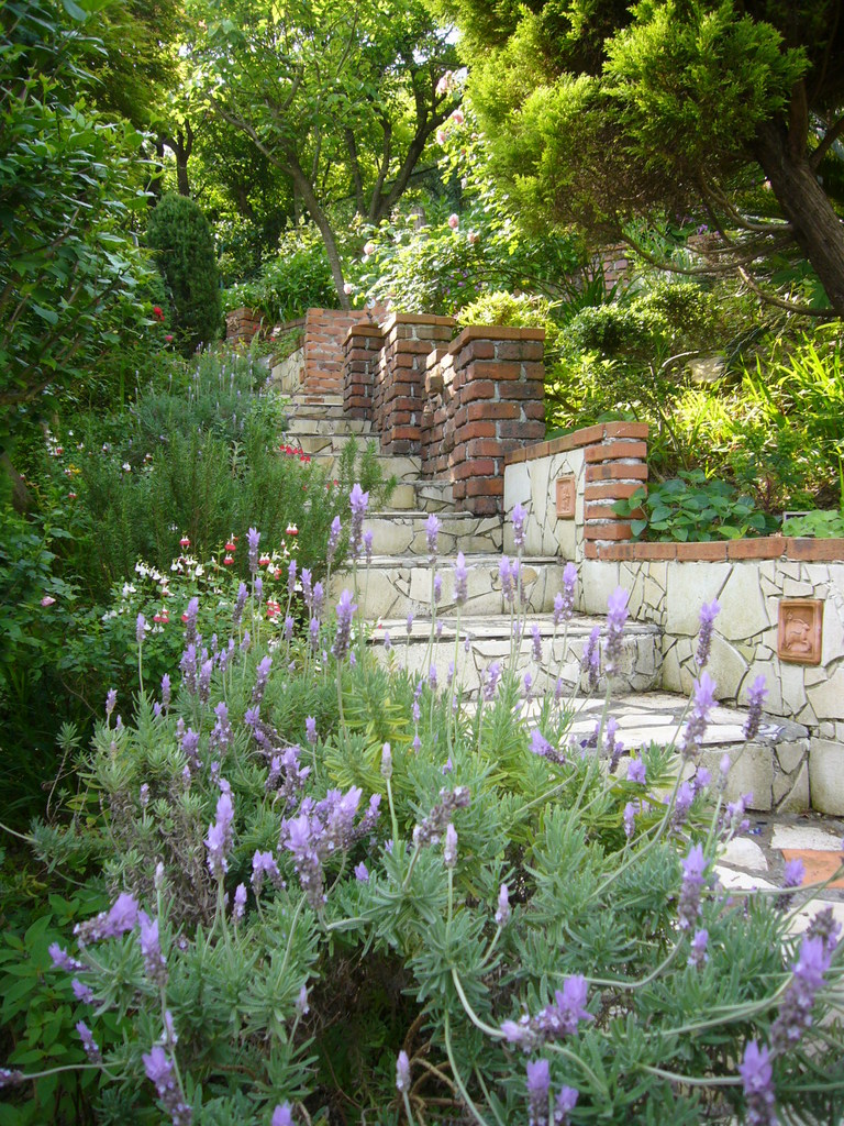 石やタイルの階段と壁は、何年も掛って夫と二人で作った力作です。