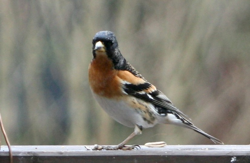 これはアトリのオス。庭にはたまにしか来ませんが、来るときには団体でやってきます。エサ台もそのときは占領して他の鳥は周りで見ています。