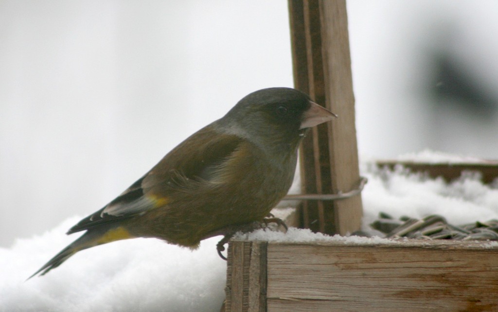 カワラヒワです。この鳥も10羽前後の群れでやってきますが、庭のあちこちでばらばらに行動します。エサ台ではシジュウカラやヤマガラと交代で突っついています。