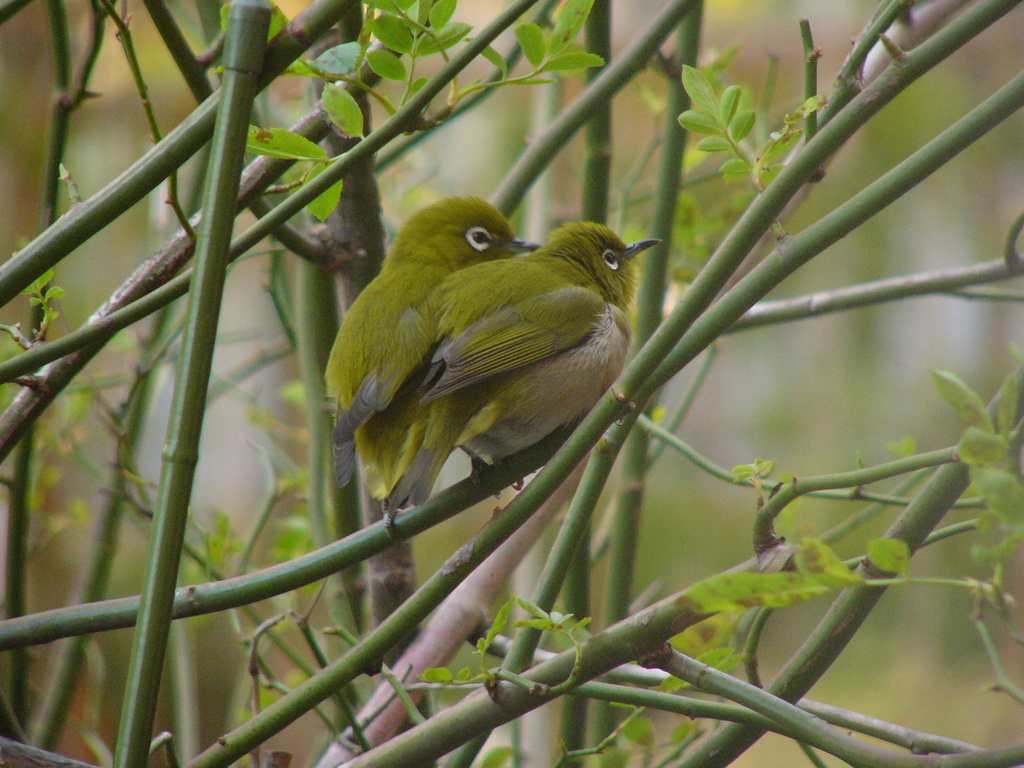 緑の保護色の中、仲の良いこの二羽は夫婦ですか?夫婦はこうありたいものですね。