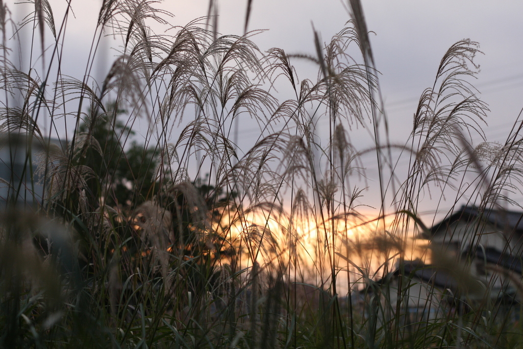 秋の夕暮れですね。ススキの尾花がまだ開いていないってことは、まだ暖かいのでしょうね。