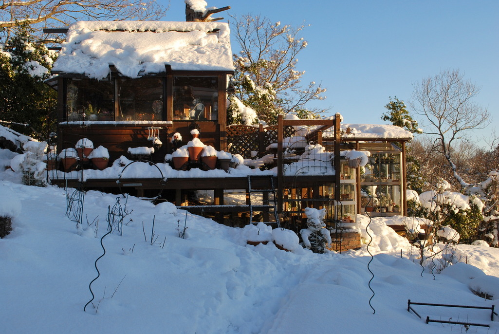 いつもは燦々と日差しが入るガーデンシェッドですが屋根に雪が積もるとこんなに暗くなってしまいます。やはりお日様は有難いです。