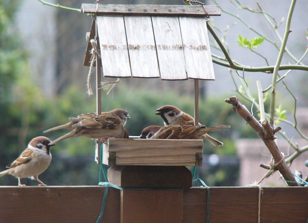 デッキの手摺の上に置いたエサ箱に群がって食べている雀達。私も入れてってもう一匹来ました。
