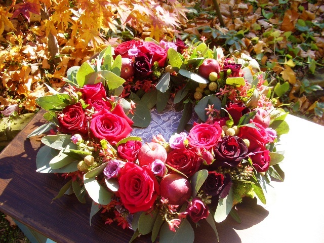 すてきなアレンジですね!リング型のオアシス・・・かな?真っ赤な薔薇にりんご、クリスマスカラーですね(*^^*)