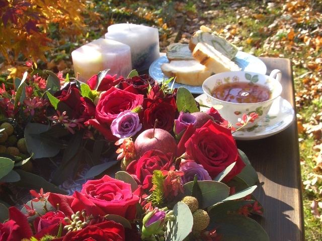 黄葉の落ち葉の中で、素敵なティータイムですね! リースもワンダフルです^^