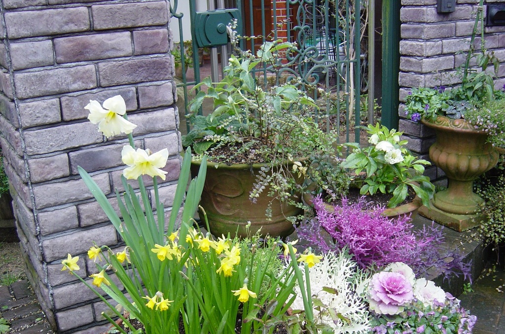 可愛らしい寄せ植えですね。スイセンやクリスマスローズの色合いも、とても素敵です。