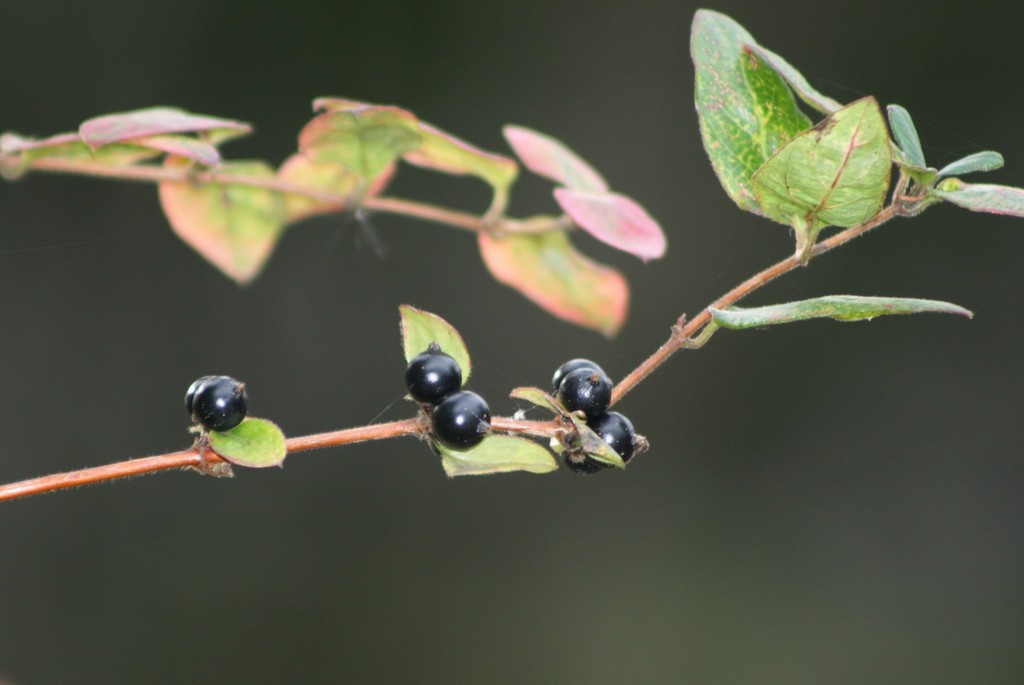 庭の冬支度をしていたときに、ふっと見るとこんな黒い実が目に入りました。今まで気が付かなかったのですが、ハニーサックルの花のあとにこんな黒い実がなっていました。