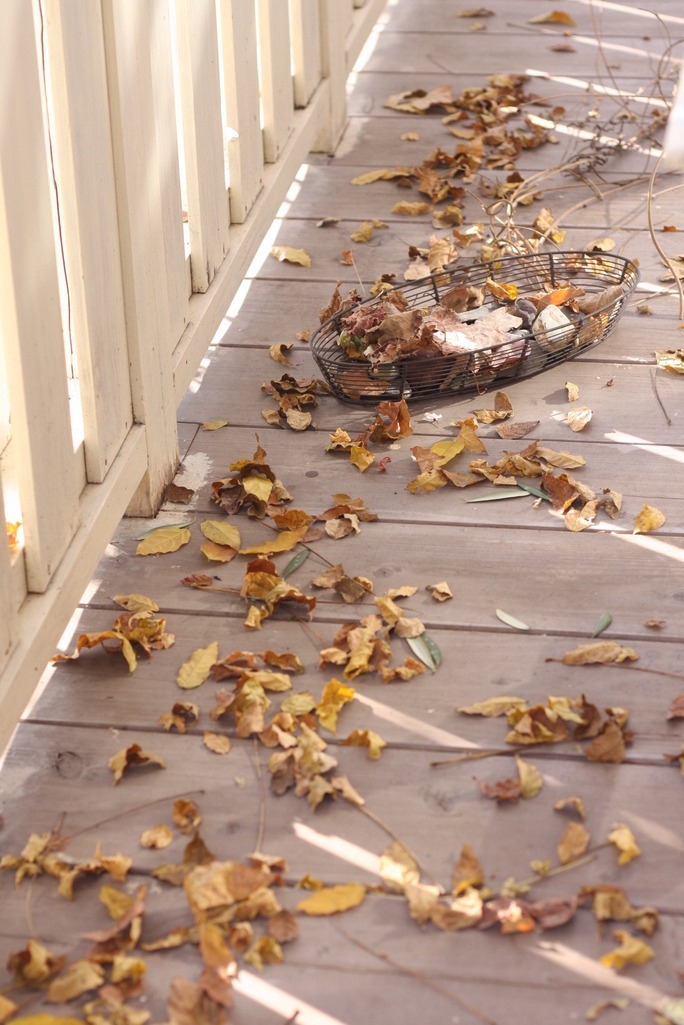 時を経たウッドデッキの床に白く塗られた手摺、吹き寄せられた枯れ葉、さりげなく置かれたワイヤーの入れ物・・奥行きのある立体的な構図でまとめられて素敵