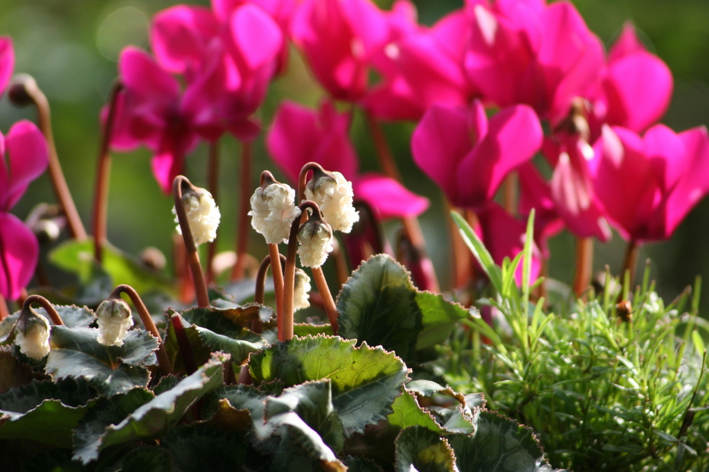 白のシクラメンのつぼみがモシャモシャっとしてて、とても可愛いです。なにか別の花か実のようにも見えます。