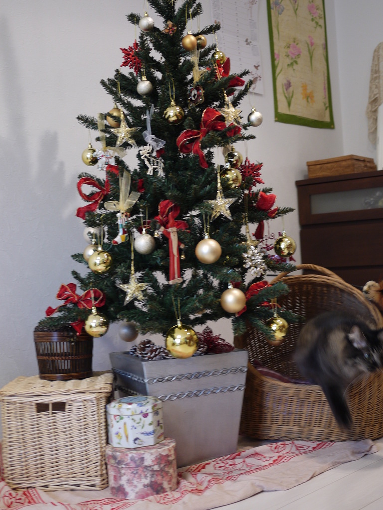 ツリー右下のかごは、猫専用かごです☆友だちのお母さんお手製です。いつもここで寝てるのですが、今回はちょっと撮影中に逃げ出してしまいました.....
