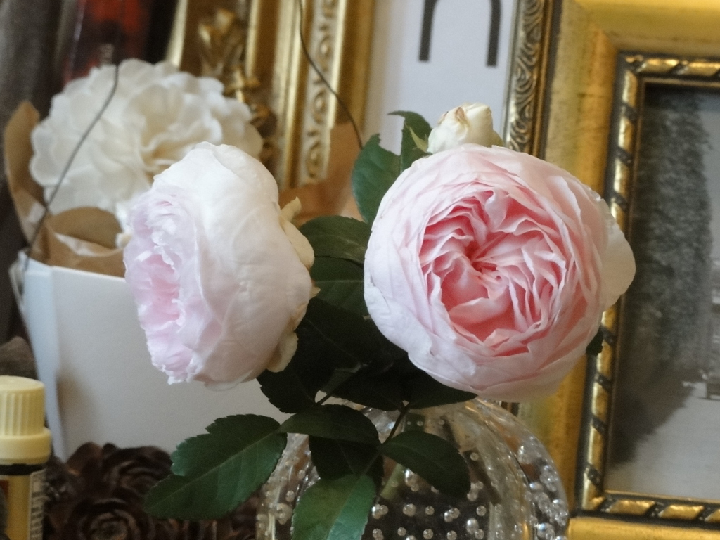 バックのレトロな額縁とオールドな花形と、やさしい色があいますね。