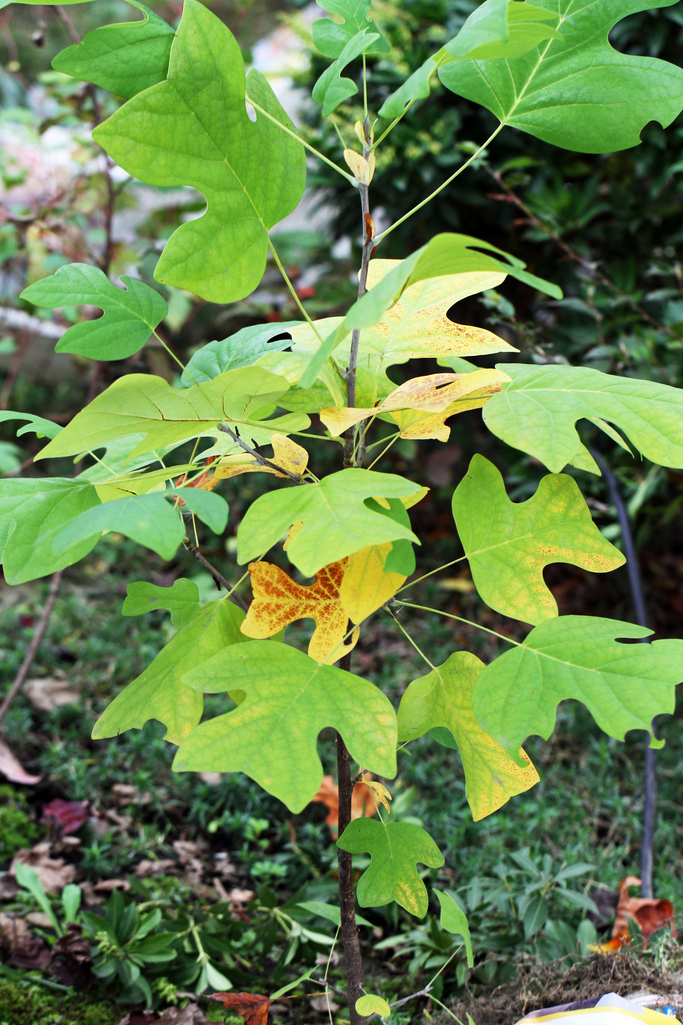 まだ青々としてキレイでしょ・・実生で生えた鳥の贈り物です 葉が半纏(はんてん)のような形なので「半纏木」 花の形から「チューリップの木」 葉の形から「奴凧の木、軍配の木」なんて呼ばれてるそうです 「シャンゼリゼ西側の歩道を凱旋門方向に歩くと、左側にマロニエ、右側にユリノキがそびえ立つ何とも贅沢な並木道ではある」と、あるHPの文章にあります でも育てるかどうかは考え中・・樹高15mの巨木になるので(;^_^A ・・