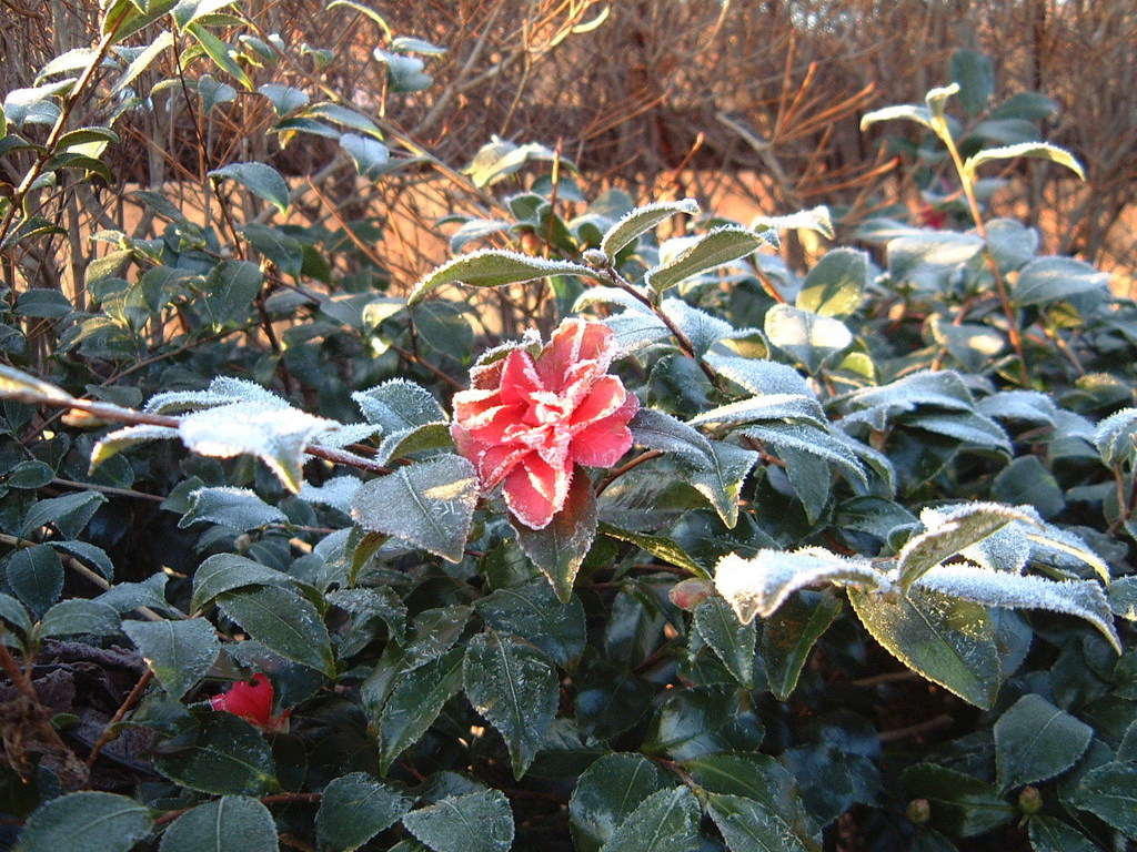 サザンカに霜がおりていました
