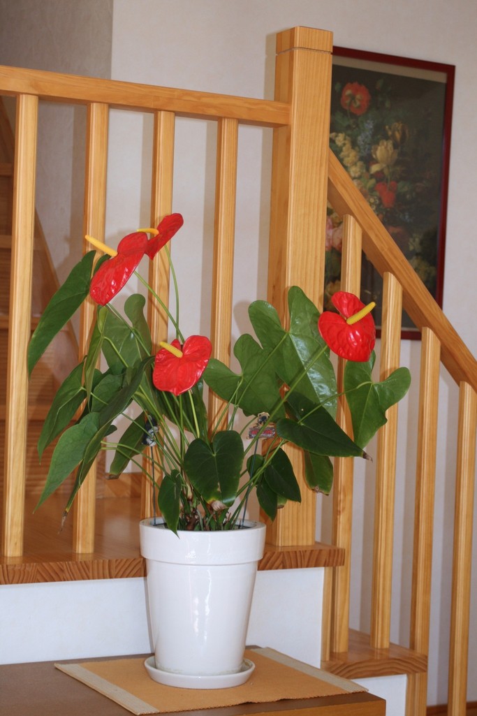 いつもはサンルームに置いているアンスリュームをリビングから二階に上がる階段の前に置いています。もう3年目ぐらいですが、よく咲いてくれます。