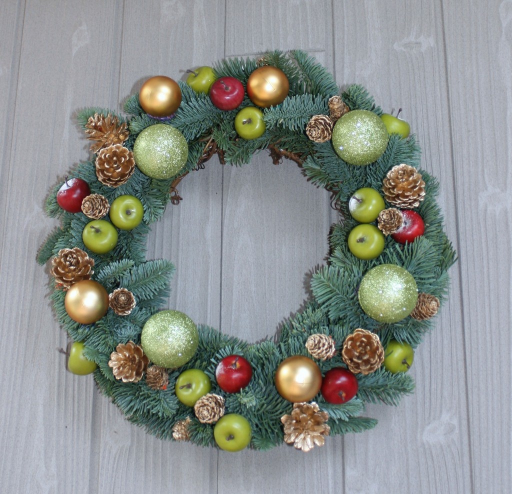 こちらはトウヒを巻いて松ぼっくりやフェイクのリンゴやプラスティックの玉をあしらいました。