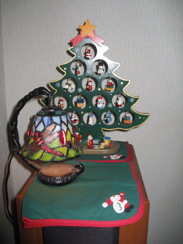ステンドグラスのランプがツリーをぼんやり照らしていい感じ