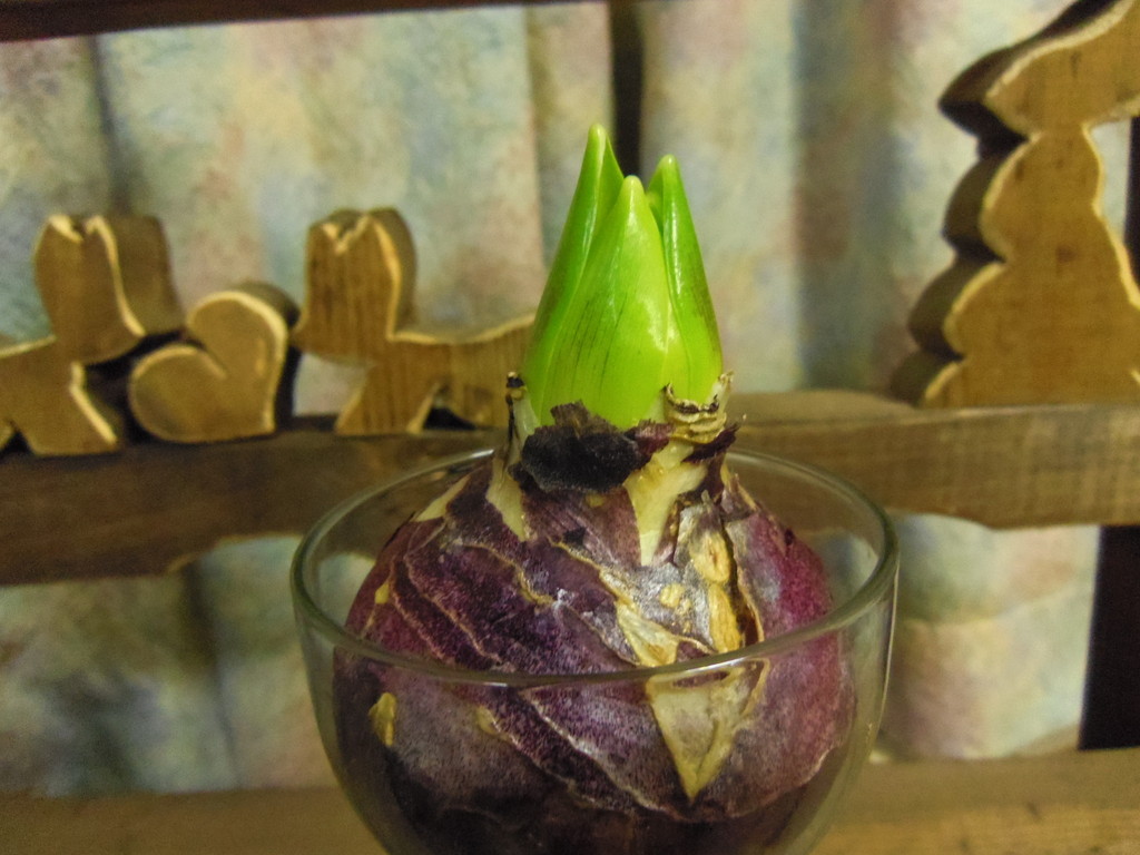 ニョッキリ芽が出ていますね。ヒヤシンスいい匂いなんですよね。大好きです。