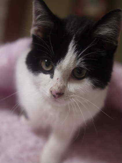 まだ警戒しているのでしょうか、眼光鋭いですね。 優しいお家に引き取られて本当によかったね^^ きっとやがてモモたんにも受け入れられて、心穏かになるでしょうね (*´∀`*)