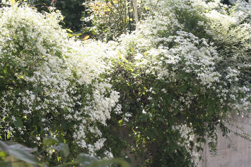 見事ですねぇ!まるで白い雪が積もったよう。クレマチスということはやはり半日蔭が好きなのでしょうか?私も育ててみたいけれど、残る壁面は畑のフェンスだけ・・・。日向じゃあムリかナぁ・・・。