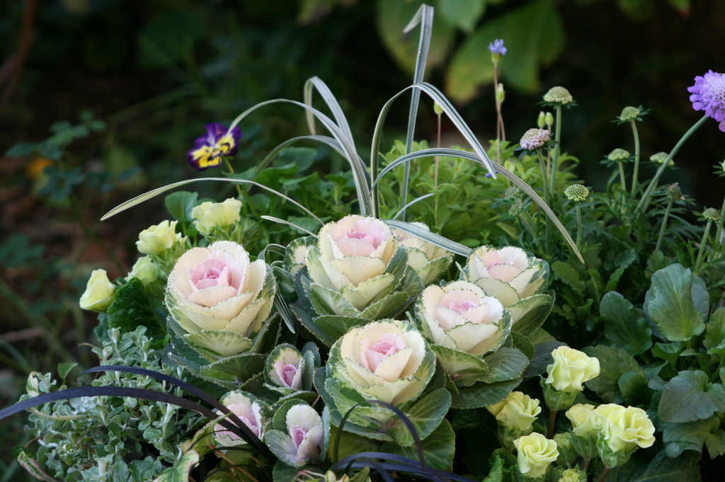 新作ですね^^!・・・ってえぇ~?葉ボタンと一緒にスカビオサが入ってる!暖かい所ではこんなこともできるんですね!すご~い^^