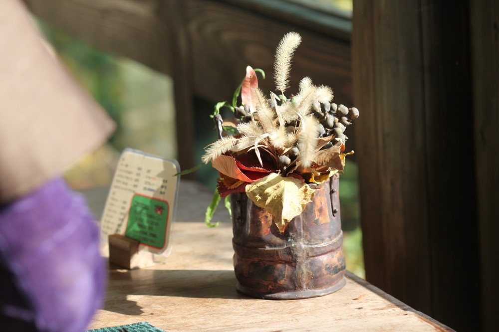 社長が作ったアレンジです。銅色の器によく合います(^-^)左にちらっと、アレンジを置いた社長の腕が…