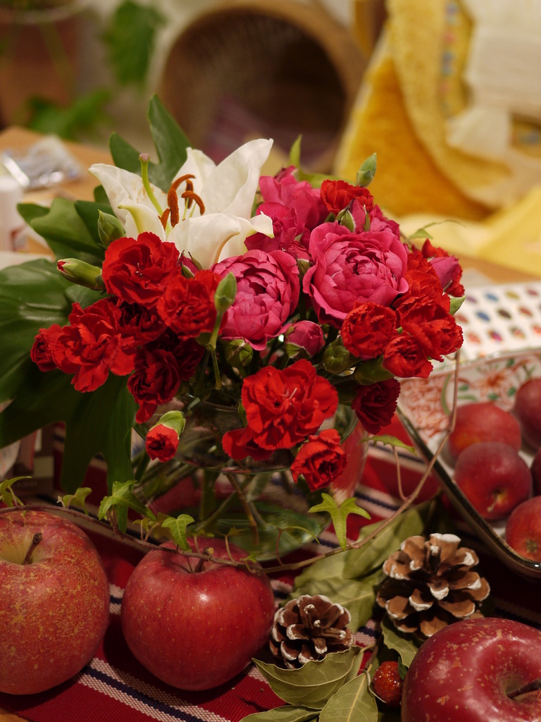 カーネーションにバラにりんごに松笠、クリスマスの雰囲気たっぷりでステキですね~(*^^*)