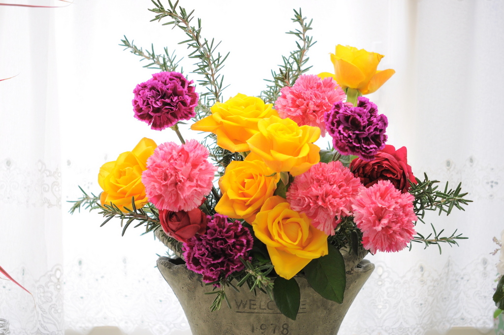 素敵な色のカーネーションですね!!アレンジも華やかでとっても温かそうです!