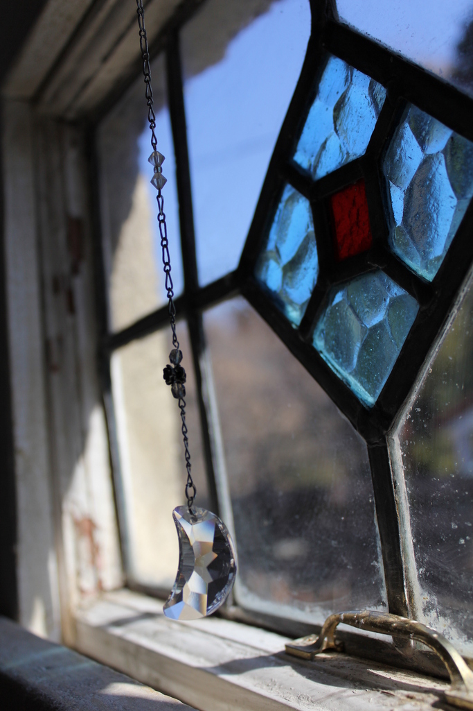 ステンドグラスの青が綺麗ですね^^お月さまの形のサンキャッチャーが、素敵!